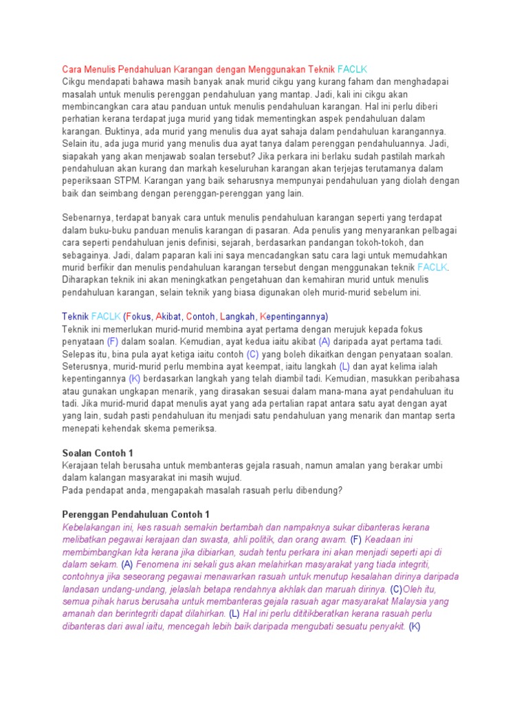 Cara Menulis Pendahuluan Karangan dengan Menggunakan Teknik FACLK Cikgu mendapati bahawa masih banyak anak murid cikgu yang kurang faham dan menghadapai masalah untuk menulis perenggan pendahuluan yang mantap. 4 thoughts on Cara Membuat Rangka Karangan dan Contoh. Ada penulis yang menyarankan pelbagai cara seperti pendahuluan jenis definisi sejarah berdasarkan pandangan tokoh-tokoh dan sebagainya.